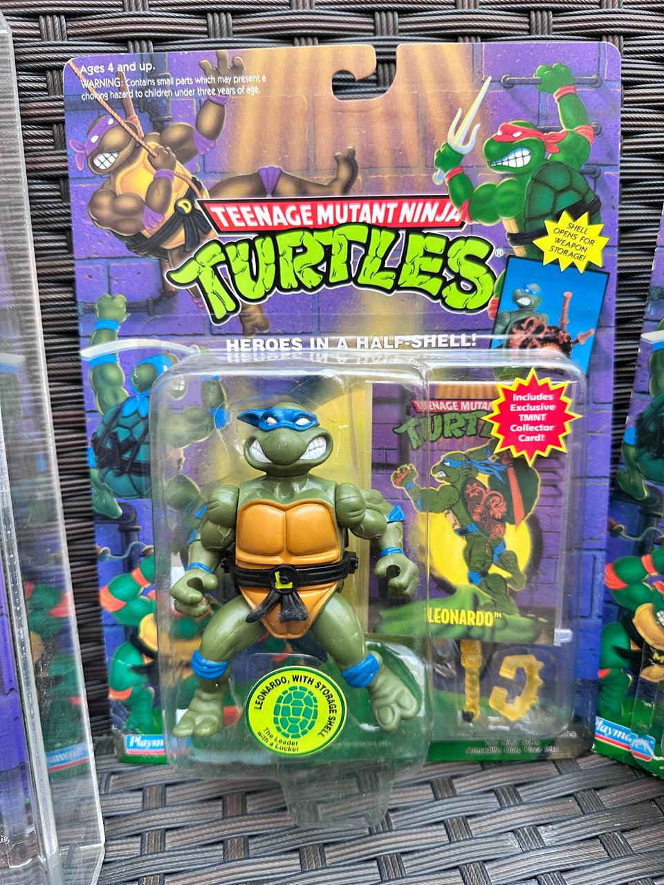 Las figuras de las Tortugas Ninja de cinturón negro son versiones raras y reeditadas de los juguetes originales de 1994, que incluyen cinturones negros y armas translúcidas. Estas figuras se consideran piezas de colección, o “santos griales”, debido a su rareza, sus diferentes tonos de piel en comparación con las originales y la dificultad para encontrarlas con todos sus accesorios. Las versiones completas se venden por cantidades considerables.