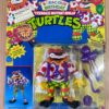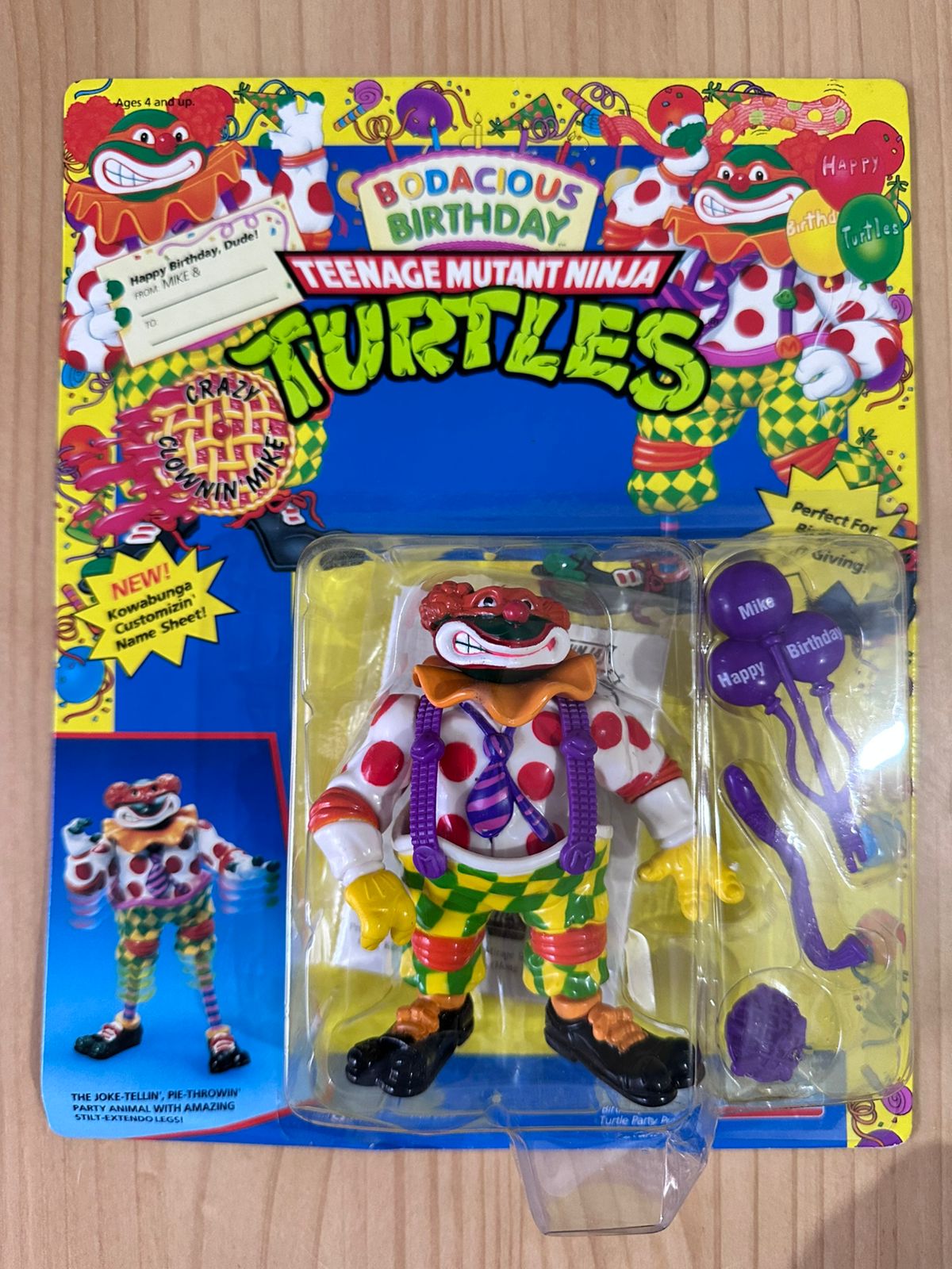 La serie Bodacious Birthday Turtles fue lanzada por Playmates Toys en 1992 como parte de la colección original de figuras vintage de Teenage Mutant Ninja Turtles. Incluye versiones festivas de tortugas: Crazy Clownin’ Mike, Classic Party Reptile Leo y Raph, the Magnificent. Cada figura mide aproximadamente 4½ a 5 pulgadas (≈11-13 cm) de alto. Las figuras venían con accesorios festivos como bocinas, sombreros o corbatas de fiesta, papeles/cartas personalizables (“name sheets”), bastones mágicos, y otros elementos decorativos. El empaque suele ser el original “carded” (sobre con blister) con tarjeta de regalo impresa (“gift tag”) sin usar. Respecto al peso/peso-con empaque, ejemplos indican alrededor de 12 onzas (≈340 gramos) en caja/plástico blister para una figura con blister sellado. De esta serie solo existen 4 personajes distintos.