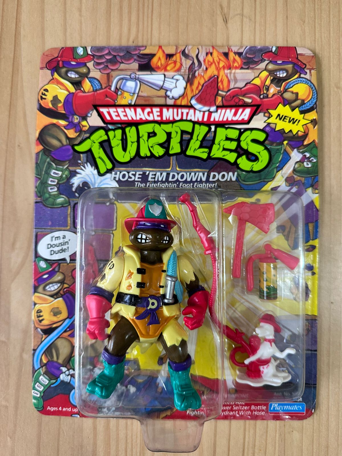 Hose ‘Em Down Don es una figura de acción lanzada por Playmates Toys en 1991 como parte de la línea clásica de Teenage Mutant Ninja Turtles. Esta figura presenta a Donatello en un atuendo de bombero, equipado con varios accesorios diseñados para combatir incendios y enfrentarse al Clan del Pie. La figura mide aproximadamente 5 pulgadas (12.7 cm) de altura y tiene un peso cercano a 85 gramos. Entre sus accesorios se incluyen un hacha de fácil acceso, una botella de agua tipo seltzer denominada “Sizzle-Fizzle Sewer Seltzer Bottle”, una manguera de bombero, un hidrante de incendios y una manguera adicional. Esta figura fue parte de una serie temática que presentó a los personajes de las Tortugas Ninja en roles inusuales, como policías o bomberos, y fue lanzada en 1991, con una segunda edición en 1992. Aunque no es una de las figuras más raras, su valor en el mercado secundario ha aumentado con el tiempo, especialmente en condiciones de empaque original. Es una pieza apreciada por los coleccionistas debido a su diseño único y su lugar en la historia de las figuras de acción de TMNT.