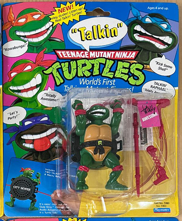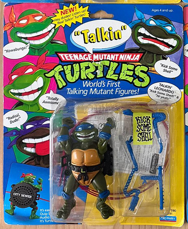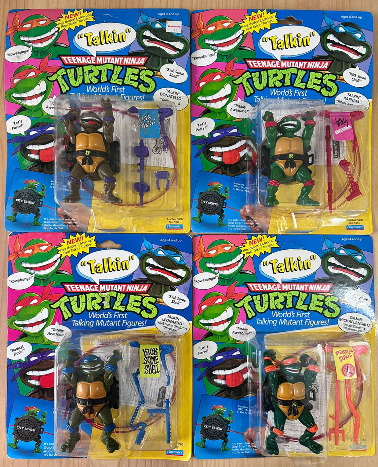 4 Turtles – Talkin’ Turtles (1992): Una línea de figuras de las tortugas con función de “hablar”. Cada figura mide aproximadamente 5 pulgadas (12.7 cm) y presenta una función de “hablar” al presionar un botón en su espalda.