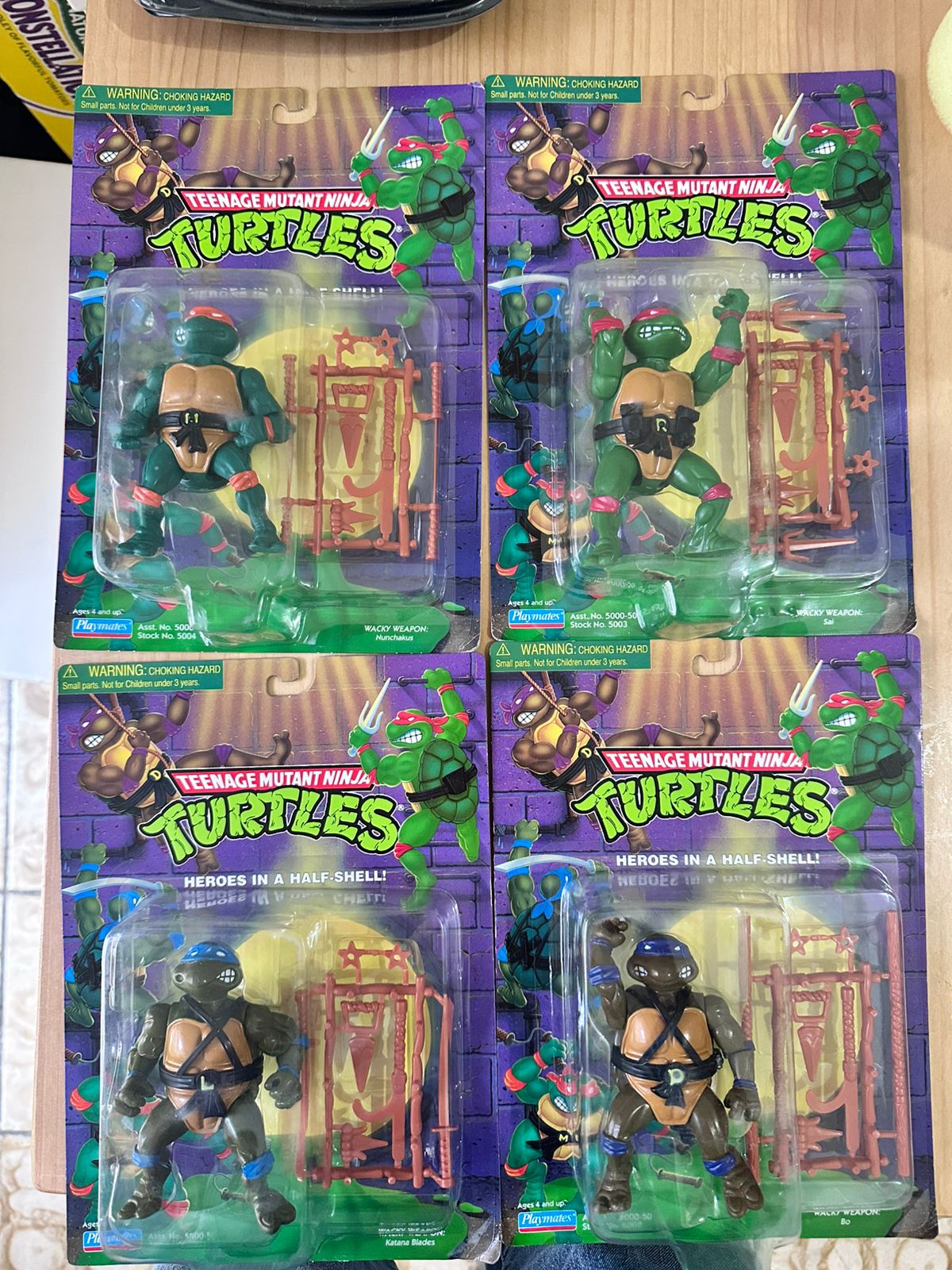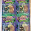 Las cuatro Tortugas Ninja clásicas —Leonardo, Michelangelo, Donatello y Raphael— fueron lanzadas por Playmates Toys en 1988, marcando el inicio oficial de la línea de figuras de Teenage Mutant Ninja Turtles. Cada figura mide aproximadamente 4.5 pulgadas (entre 11 y 12 cm) y está hecha de plástico resistente con articulaciones móviles en brazos, piernas y cabeza. Cada tortuga incluía su set de armas distintivas moldeadas en plástico marrón: Leonardo con sus katanas, Michelangelo con sus nunchakus, Donatello con su bō y Raphael con sus sais. También venían con un cinturón desmontable y una ficha tipo tarjeta con su biografía. Su peso individual ronda los 200 gramos, variando ligeramente según los accesorios. Estas figuras destacan por su diseño original, más cercano al cómic que a la caricatura posterior, con tonos de piel distintos y expresiones únicas en cada rostro. Son consideradas el punto de partida del fenómeno TMNT en el coleccionismo, y las ediciones de 1988 con empaque original son hoy piezas altamente valoradas por su rareza y por ser las primeras representaciones físicas oficiales de las tortugas mutantes.