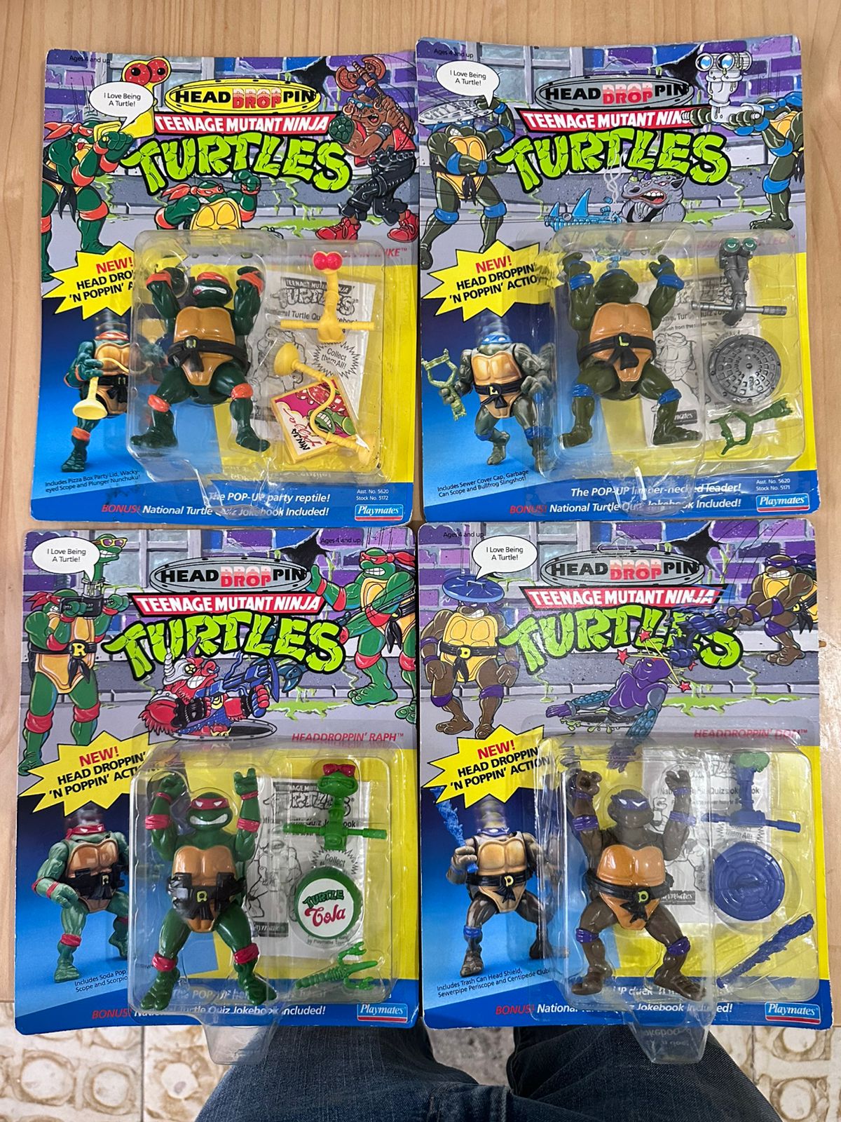 “Head Droppin Pack” es una sub-línea / variación de figuras de acción de las Tortugas Ninja producidas por Playmates Toys. La característica especial de estas figuras es que tienen una función mecánica: puedes presionar la cabeza para que se “hunda” (drop) en el caparazón, y luego apretar las piernas para que salga (pop back up). Es como un mecanismo de “esconder cabeza / sacar cabeza”. Año 1991-92