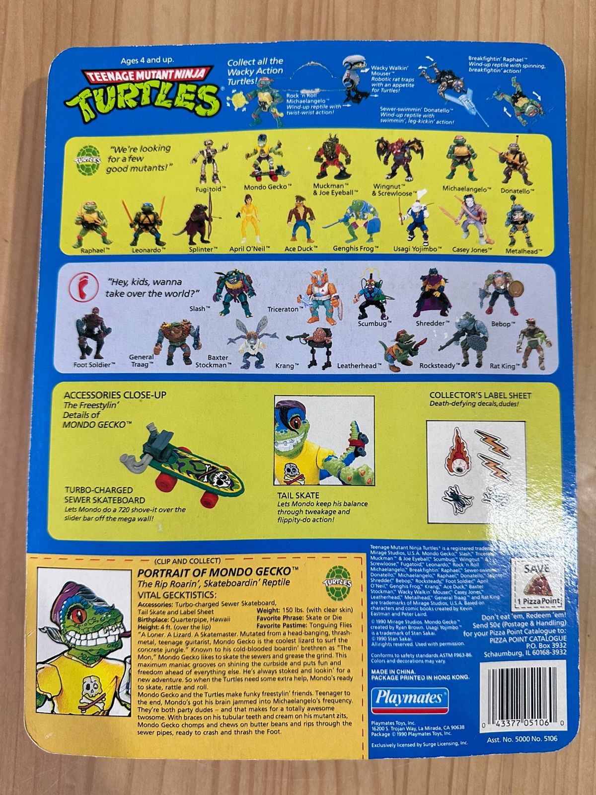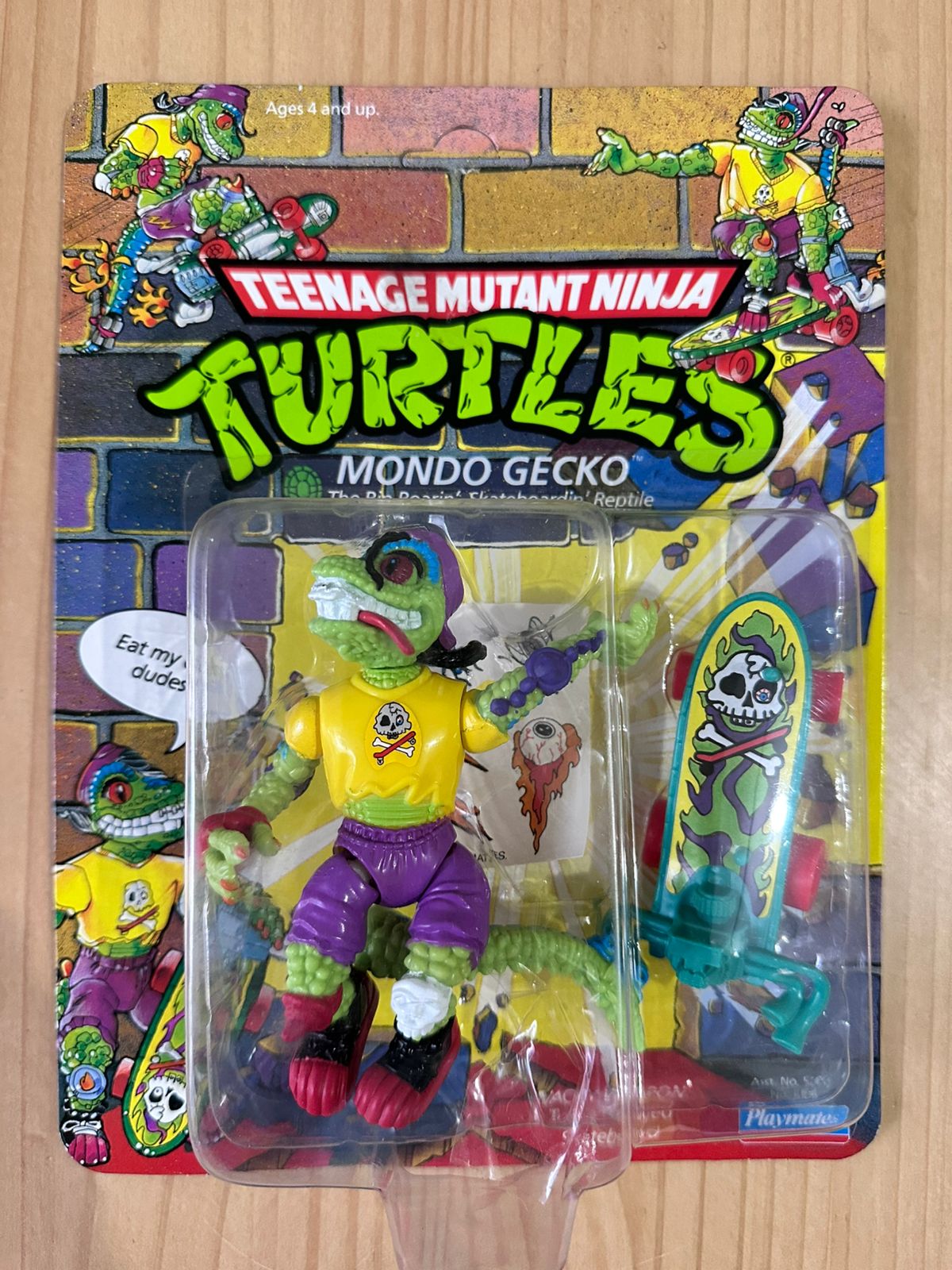 Mondo Gecko (1990): Mondo Gecko es un mutante gecko californiano con actitud de skater. Mide aproximadamente 4.5 pulgadas (11.4 cm) y pesa alrededor de 200 gramos. Incluye una tabla de skate y una pistola de rayos. Su diseño destaca por su estilo relajado y su actitud despreocupada.