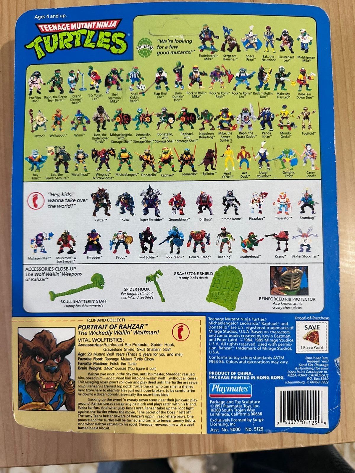 Rahzar (1992): Un villano mutante con habilidades de combate. La figura mide alrededor de 5 pulgadas (12.7 cm) y presenta una armadura de combate. Incluye una espada y una mochila.