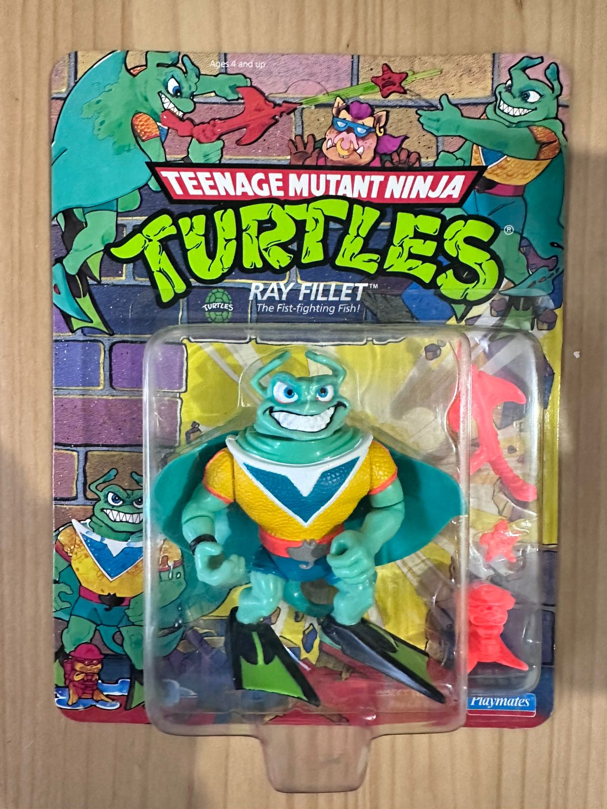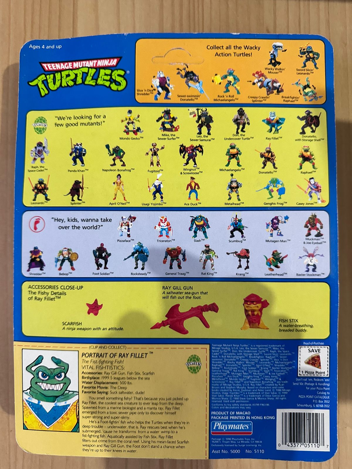 Ray Fillet (1990): Un mutante pez manta que lucha contra el crimen bajo el agua. La figura mide alrededor de 5 pulgadas (12.7 cm) y presenta una acción de “cambio de color en el agua”. Incluye una pistola de rayos y una aleta de tiburón.